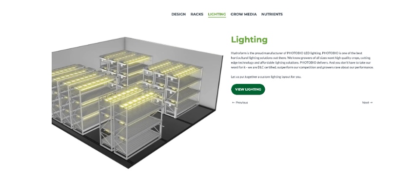 The homepage of Hydrofarm Commercial Solutions begins with an extensive selection of product categories, paired with visuals, to help the buyer begin their search. The homepage also includes a unique layered animation of a commercial grow facility to demonstrate the full range of services provided by the Hydrofarm Commercial team. As the user scrolls, the animation layers shelving, lights, and nutrients into the empty room.